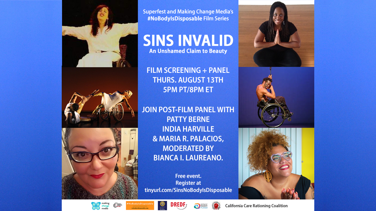 Join @sinsinvalid FILM + PANEL w/Patty Berne, India Harville, Antoine Hunter, Maria Palacios & Bianca Laureano @goddessonwheels, @LatinoSexuality & @iharville. Thurs, 8/13, 5pm PT/8pm ET. Free. Register @ tinyurl.com/SinsNoBodyIsDi… #NoBodyIsDisposable