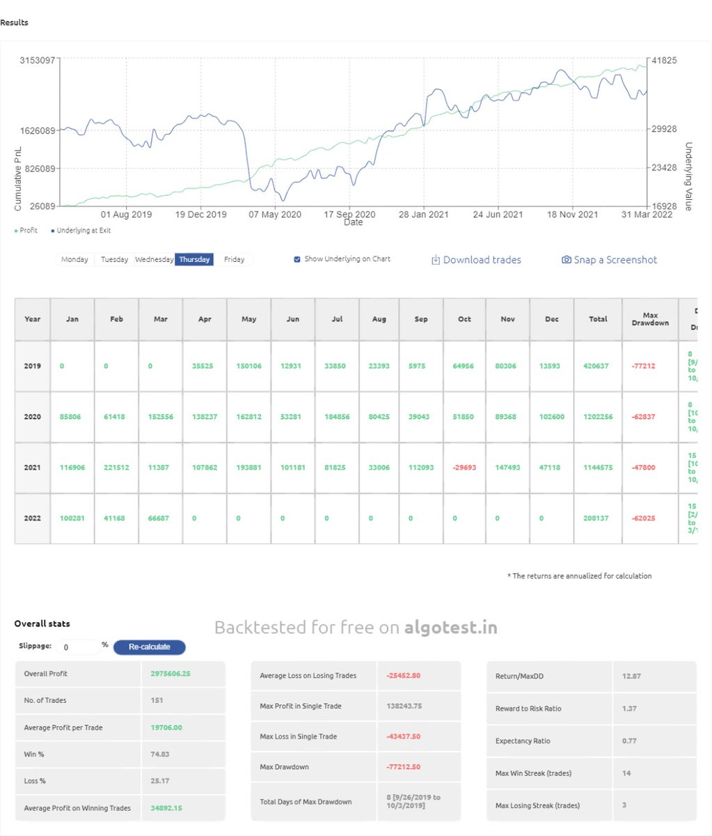 Tested a strategy on stock mock with different permutations and combinations with total 1% slippage considered. Best part is, DD is very much under control. Retweet to get this whole combination and pdf in dm.