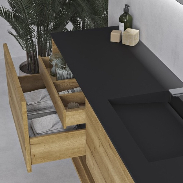 Corian® Colour Tennessee Solid Oak Carthage Wall Mounted DuPont™ Vanity Unit by Galfia. Ask your local #stockist or #showroom about Galfia products today. galfia.com #luxurybathrooom #interiordesign #interiors #bathroomdesign #remodeling #bathroomremodel