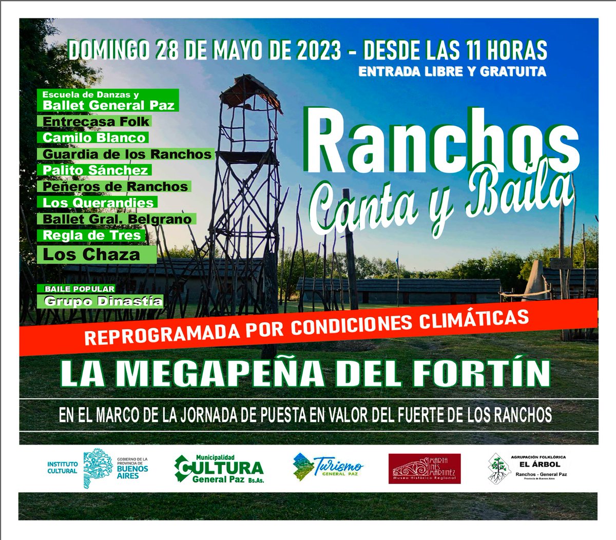 🤚 SE REPROGRAMA "RANCHOS CANTA Y BAILE" ℹ A las y los vecinos les contamos que pr motivos climáticos se pasará el festival para el domingo 28 de mayo a las 11hs.