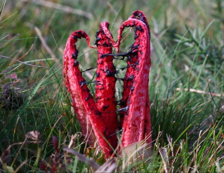 The fungus Clathrus archeri (devil's fingers), The surface of the fingers has a terrible smell due to an olive-colored, brown to black slime within which the spores are stored. The slime's rotting meat smell attracts flies and other insects. healing-mushrooms.net/clathrus-arche…
