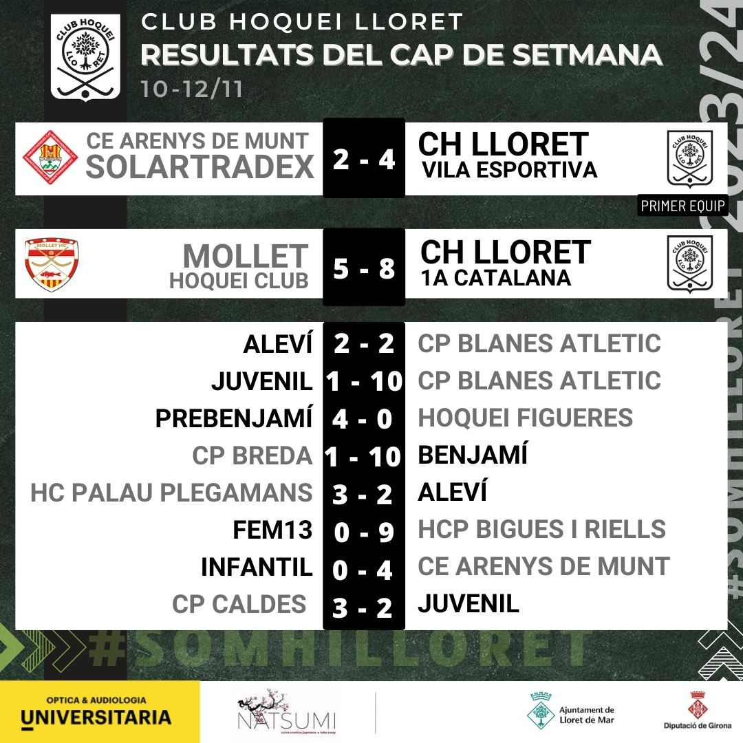 🏑ℝ𝔼𝕊𝕌𝕃𝕋𝔸𝕋𝕊 𝔻𝔼 𝕃𝔸 𝕁𝕆ℝℕ𝔸𝔻𝔸🏑El cap de setmana ja acabat. Aquí tenim els resultats que ens ha deixat la jornada. Seguim lluitant i evolucionant!! Som'hi Lloret!! #opticauniversitaria #natsumilloret #esportssurierlloret #renohockey #panxoslloret #serenitygarden