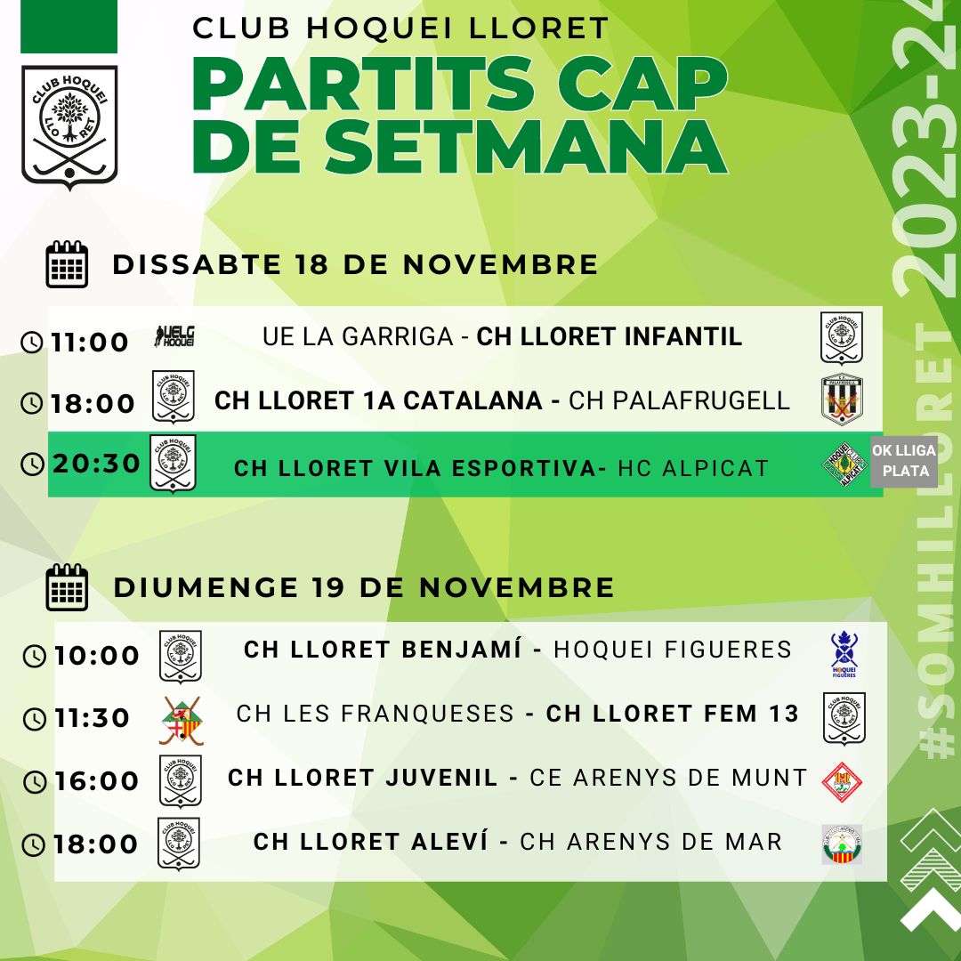 🏑𝙋𝘼𝙍𝙏𝙄𝙏𝙎 𝘿𝙀𝙇 𝘾𝘼𝙋 𝘿𝙀 𝙎𝙀𝙏𝙈𝘼𝙉𝘼🏑 Aquí teniu un llistat per no perdre detall. Entre tots, hem de ser el jugador número 6 i animar als nostres jugadors/es🏑🥅 #somhilloret #hoquei #hoqueipatins #capdesetmana #lloretdemar #lloretvilaesportiva #oklligaplata