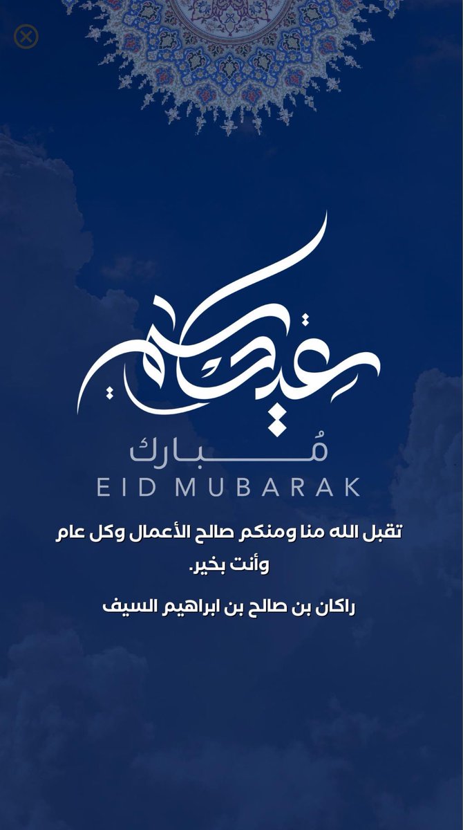 أهنئكم بعيد الفطر المبارك، بعد أن أكرمنا المولى سبحانه بصيام شهر رمضان وقيامه. سائلين الله في هذا العيد أن يديم على بلادنا أمنها واستقرارها وازدهارها، وأن يعم الأمن والسلام أمتنا الإسلامية والعالم أجمع. وكل عام وأنتم بخير.