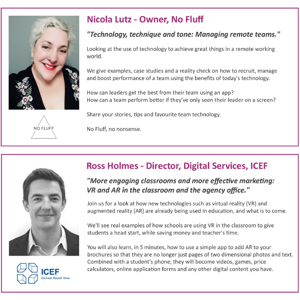 Our conference continues with two interesting seminars. ‘VR and AR in the classroom and the agency office.’ by Ross Holmes and ‘Managing remote teams.’ by Nicola Lutz. #iedtc