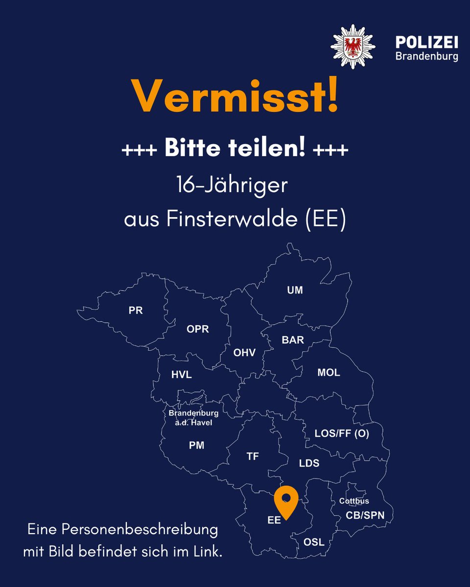 #Fahndung Wir bitten um Unterstützung bei der Suche nach einem 16-Jährigen aus Finsterwalde (EE). Er wird seit dem 27.11.23 vermisst. Mehr Infos & ein Bild: polizei.brandenburg.de/fahndung/vermi… Hinweise ☎️ 03531 7810