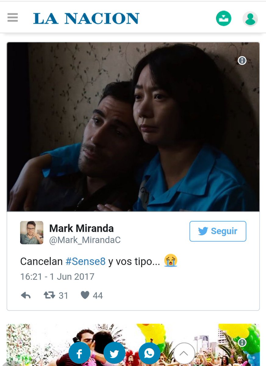 Gracias diario @LANACION por usar mi tuit para la nota "El enojo de los fans de Sense8 al enterarse de su cancelación" #Sense8 #RenewSense8