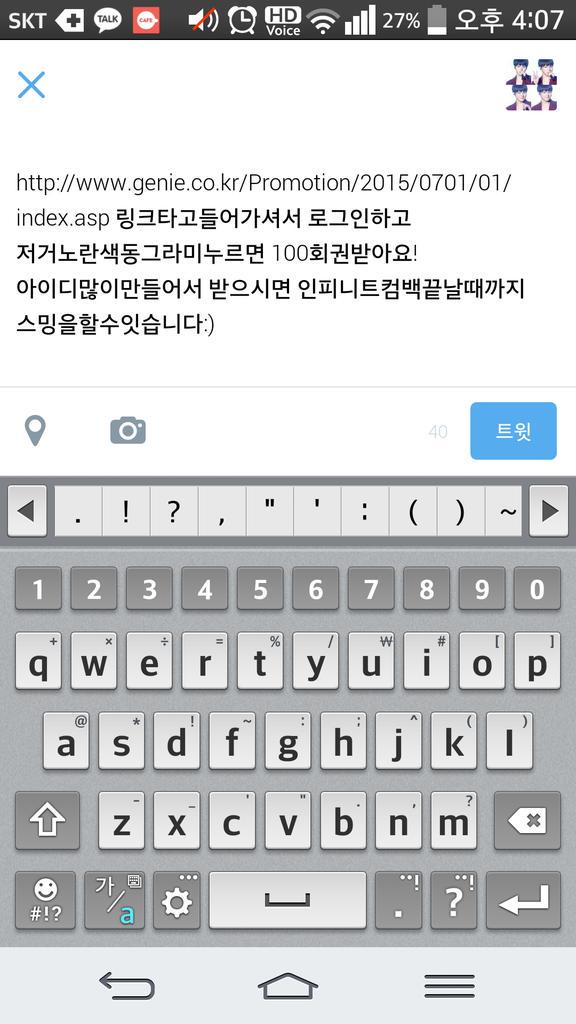 5K Followers 8 Following 가수 인피니트 (Infinite)의 가사를 올리는 봇/ 2011.11.14 ~ing/ 문의사항, 오타지적은 모두 @kyuzizi_grace로/ 수동봇/ 활동시간 AM8 ~ 자정/ 맞팔&홍보&알티 요청 받지 않습니다