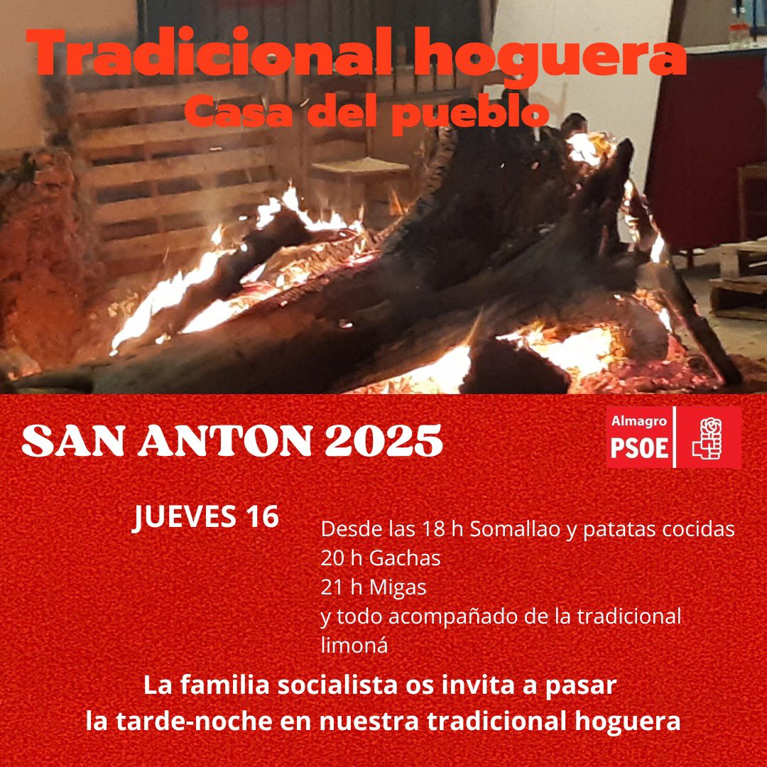 📆Mañana, Jueves 16 de Enero, celebraremos San Antón con nuestra tradicional hoguera junto a la Casa del Pueblo del PSOE de Almagro. Os esperamos a tod@s .🔥 Más información en el cartel⬇️