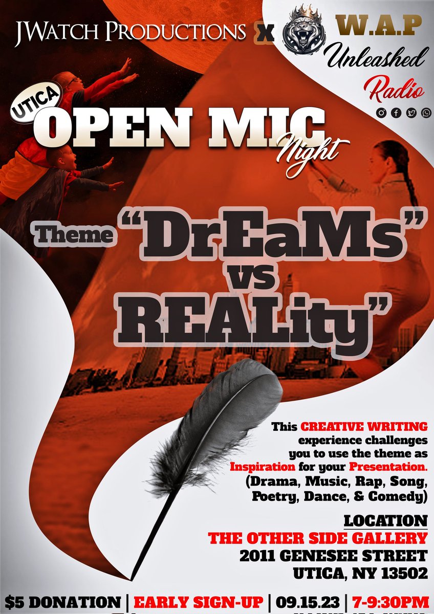 JWatch Productions has partnered with W.A.P. Unleashed Publishing to bring you another AMAZING night of Talented Entertainers. The Theme for the night is "DREAMS VS REALITY" and Whatever you feel that means to you. You are welcome to UNLEASH your CREATIVITY. Early Online
