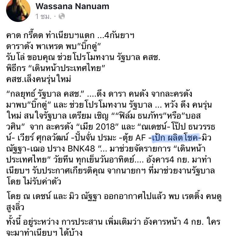 จากเฟสบุ๊คคุณวาสนา นาน่วม รอดูว่าจะได้เห็นผลิตโชคในรายการเดินหน้าแระเทศไทยมั้ย แต่แค่มีชื่อติดมาด้วยก็ดีใจแล้วอ่ะ #เป๊กผลิตโชค