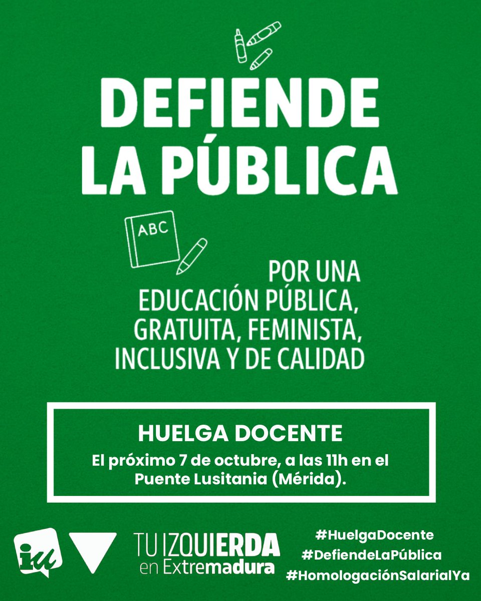 ✏️ El 7 de octubre el personal docente de los centros educativos públicos de #Extremadura están llamados a la huelga. Seas docente, estudiante o familia, ¡Apoya!
