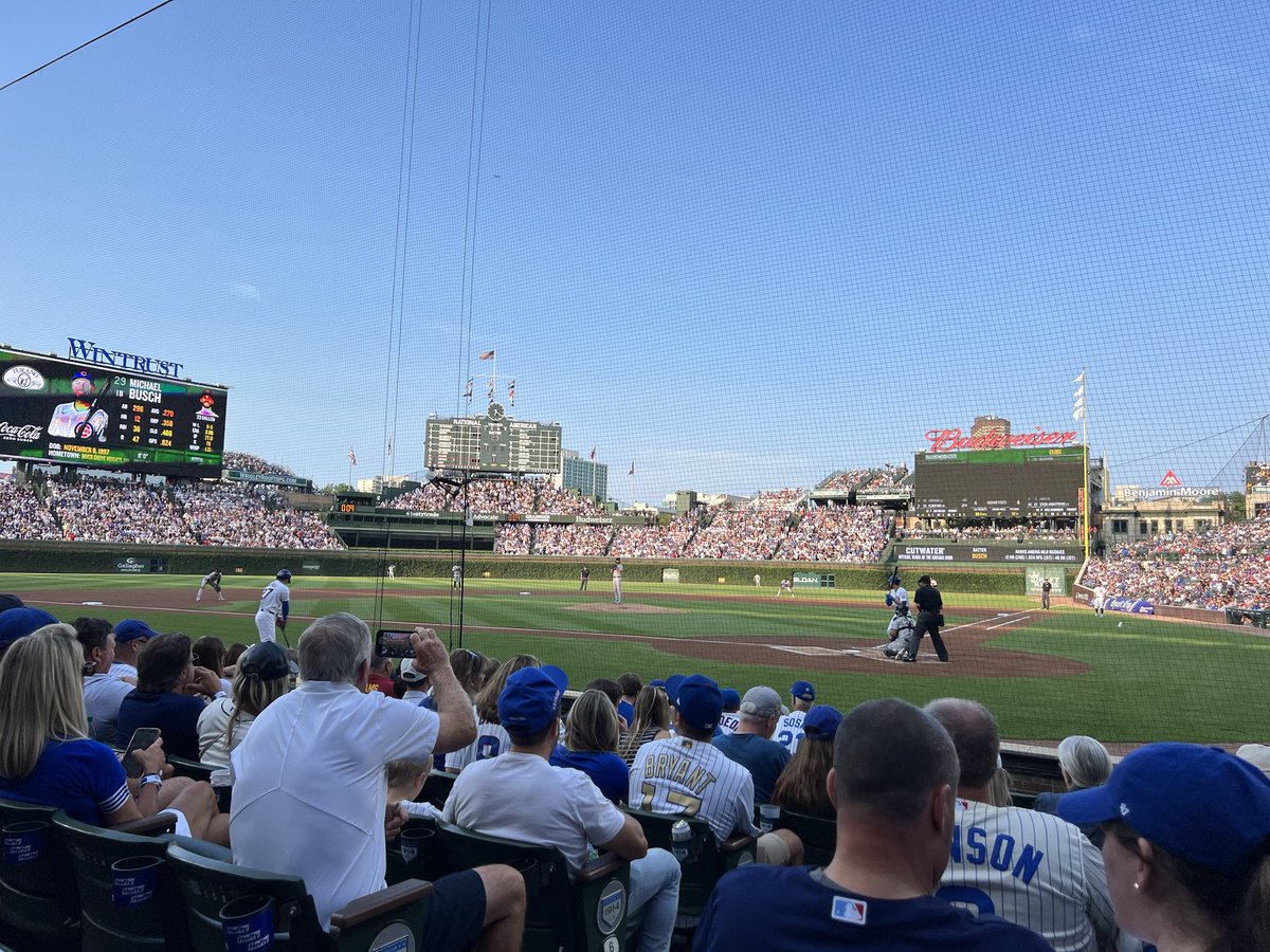 Fun night at Wrigley Field, as @DiamondHeels alums @zacgallen23 and Michael Busch face off. And who is that proud fan in the lower left videoing every at bat? Former head coach Mike Fox.