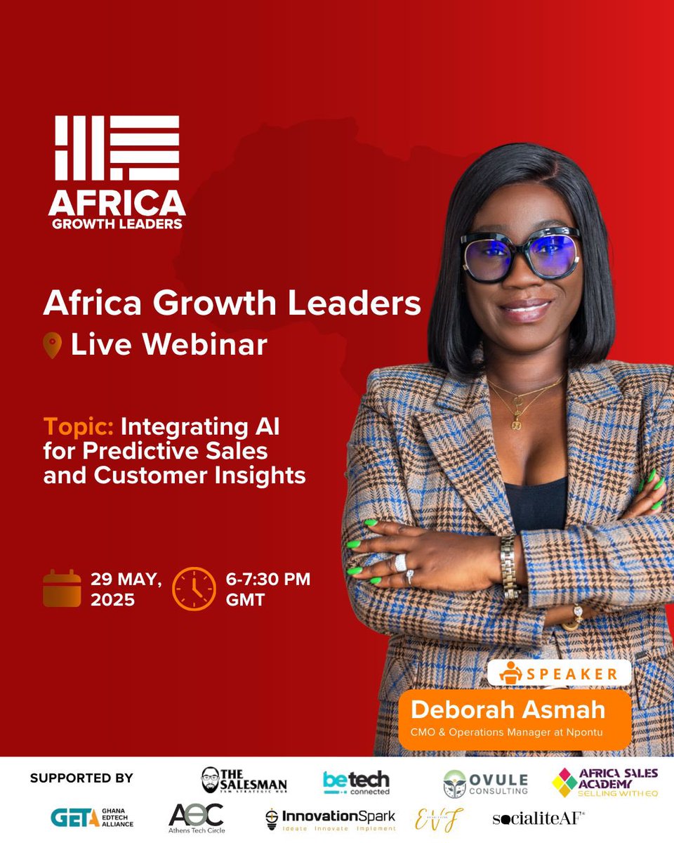 🚨 We’re live at the #AfricaGrowthLeaders Webinar on May 29! Join us as our CMO, Deborah Asmah, dives into how AI is transforming predictive sales + customer insights across Africa. 💡 🕕 6–7:30 PM GMT | 📍 LinkedIn Live #AI #SalesTech #CustomerIntelligence #Npontu #AGL2025