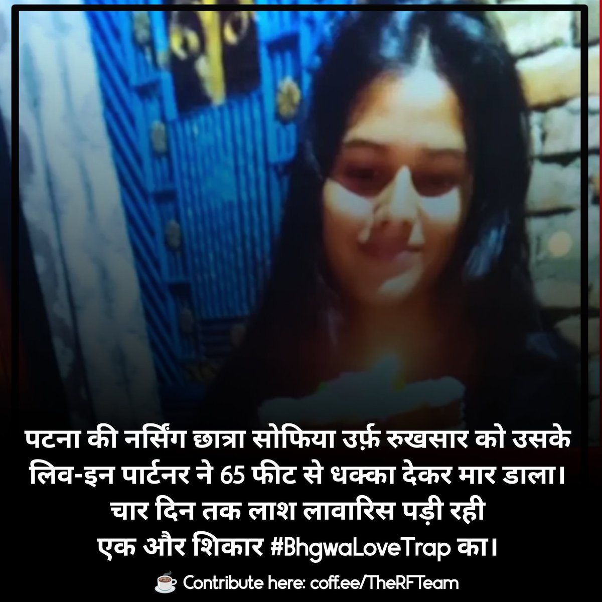Sofia left her home after a fight with her parents to live with the love of her life, Amit Kumar only for him, her live-in partner, to throw her to her death. Media channels that make noise 24/7 in name of “love-Jihad” will now remain silent on this. because victim is Muslim.