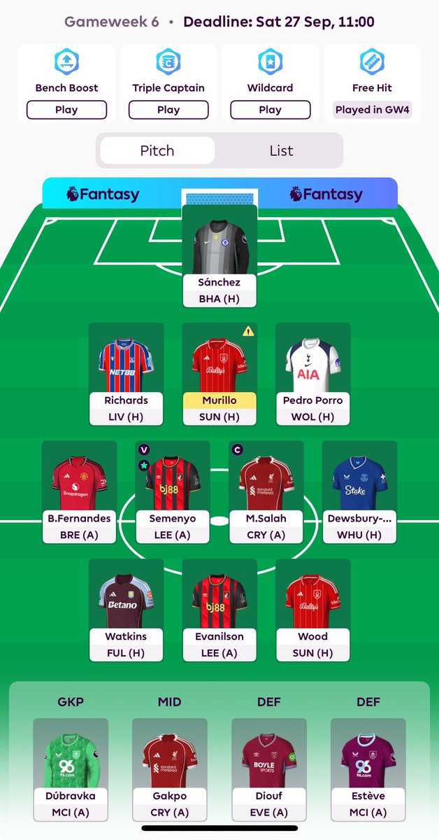 If Murillo isn’t fit for GW6 I’m going to be forced into a Wildcard a week earlier than planned and Triple Captain later on