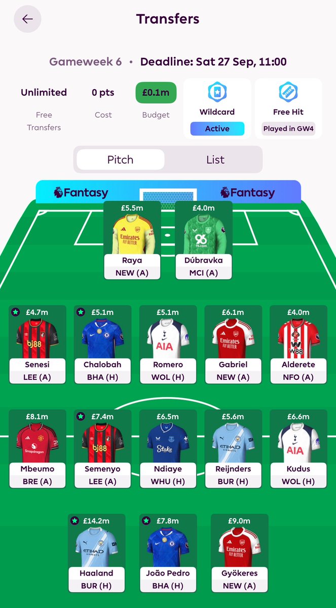Raya ➡️ Pope on Wildcard GW6