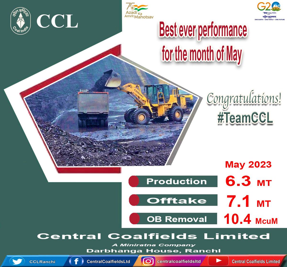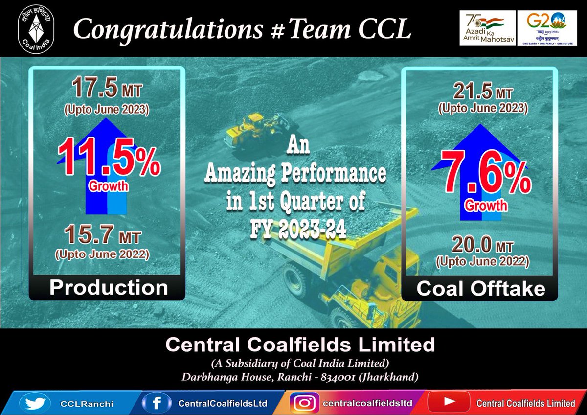 #TeamCCL को वित्तीय वर्ष 2023-24 के प्रथम तिमाही में अभूतपूर्व प्रदर्शन के लिए बधाई। सीसीएल ने प्रथम तिमाही में कोयला उत्पादन में 11.5 % की वृद्धि दर्ज करते हुए 17.5 मि. टन का उत्पादन तथा प्रेषण में 7.6% की वृद्धि दर्ज करते हुए 21.5 मि. टन प्रेषण किया है। #ऊर्जाप्रहरी