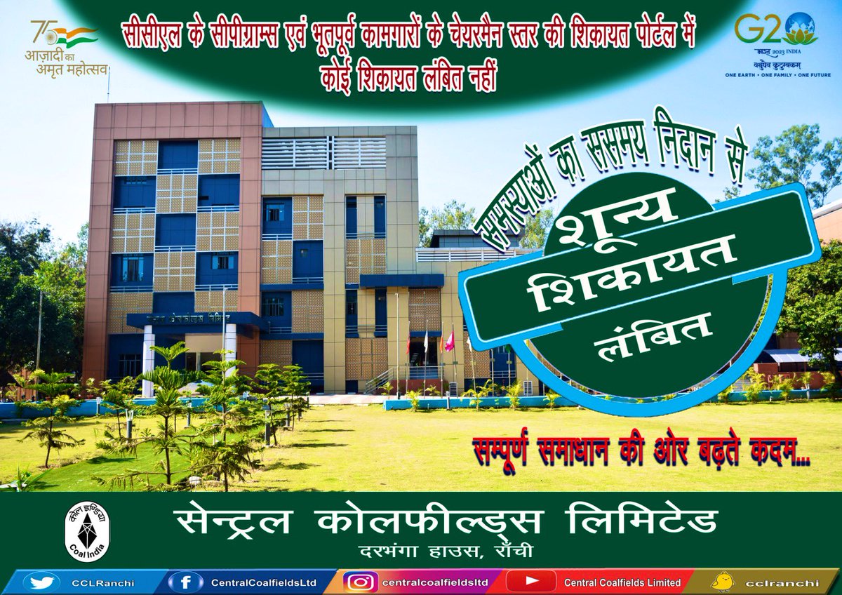 'जीरो ग्रीवांस' की ओर अग्रसर सीसीएल.. सीसीएल के सीपीग्राम्स एवं भूतपूर्व कामगारों के चेयरमैन स्तर के शिकायत पोर्टल में कोई शिकायत लंबित नहीं है. यह समस्याओं के ससमय संपूर्ण समाधान के लिए हमारी प्रतिबद्धता का परिचायक है.#transparency