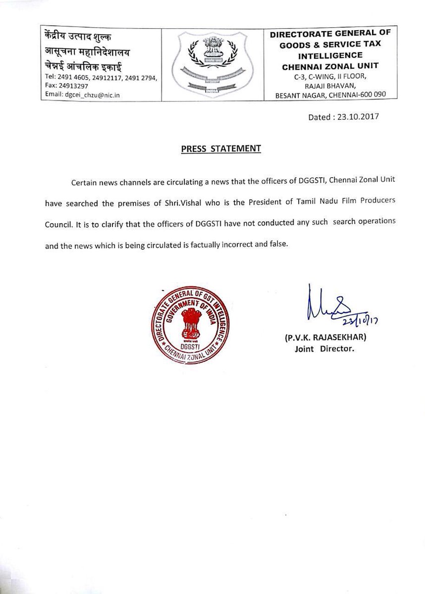 Directorate General of GST intelligence, Chennai denies they have searched the premise of #Vishal and no such operation was conducted!