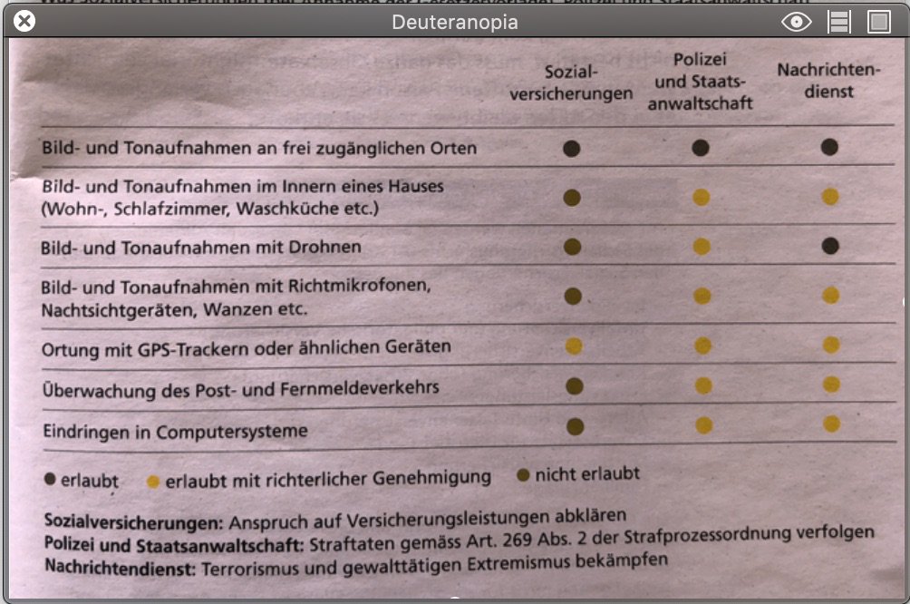 Danke @weibelm für das Beispiel. Nutze ich gern in die Vorlesung. Bei den Abstimmungsinformationen im November 2018 werden 10% der männlichen CH Wähler schlecht informiert. Bei den Frauen sind es weniger als 1%. Im Bild Simulation Rot-Grün Farbblindheit.