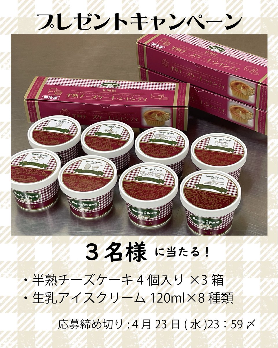 締め切り:4月23日(水)23:59 \🥳豪華プレゼント🎉/ 3名様 🎁半熟チーズケーキ4個入X3箱 🎁生乳アイスクリーム8種類 ①搾りたて牛乳②山いちご③ハスカップ ④クリームチーズ⑤モカコーヒー⑥紅茶 ⑦プレミアムバニラ⑧チョコクッキー 【応募方法】 ① @nordic_farm をフォロー ② この投稿をリポスト