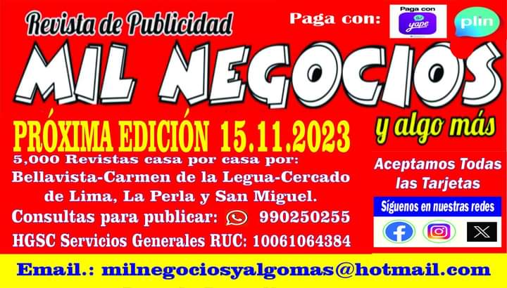 Bellavista, 09 de noviembre del 2023 El 15 del presente. saldrá nuestra revista Mil Negocios y algo más, por Bellavista, Carmen de la Legua, Cercado de Lima, La Perla y San Miguel.
