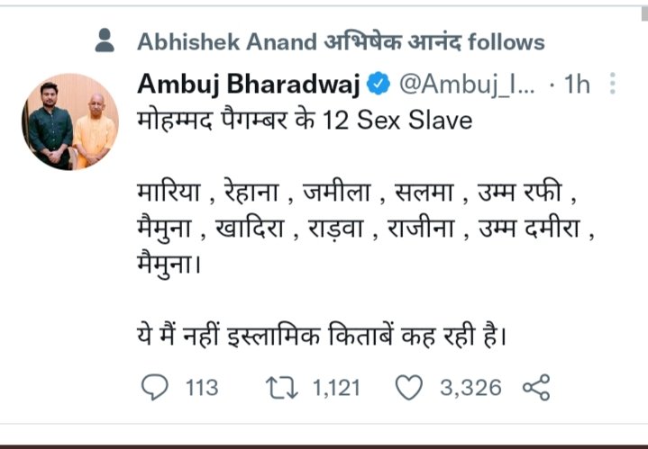 महोदय @Uppolice @CPDelhi @DelhiPolice यह व्यक्ति सोशल मीडिया पर इस्लाम धर्म और हमारे पैगंबर मोहम्मद ﷺ का मजाक बना रहा है इन लोगो का हिम्मत क्यों बढ़ते जा रहा है के जब जो चाहें, आता है और नफरत फेलाना शुरू कर देता है ? इन पर कारवाई क्यों नही होती ? #ArrestAmbujBharadwaj