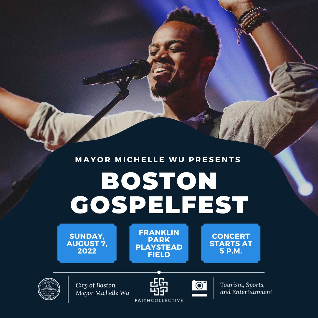 Join us for the 2022 Boston Gospel Fest with special guest Travis Greene at the Playstead Field at Franklin Park on Sunday, August 7. This event is free and open to the public. Learn more: boston.gov/calendar/2022-…