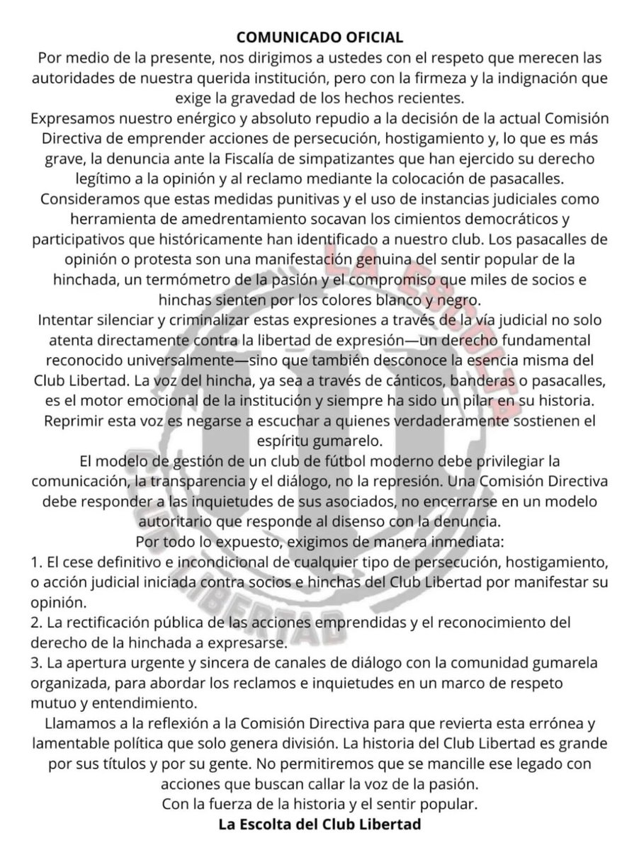 🏁 “La Escolta” emitió un fuerte comunicado en respuesta a las represalias adoptadas por la dirigencia. @DeporteTotal780