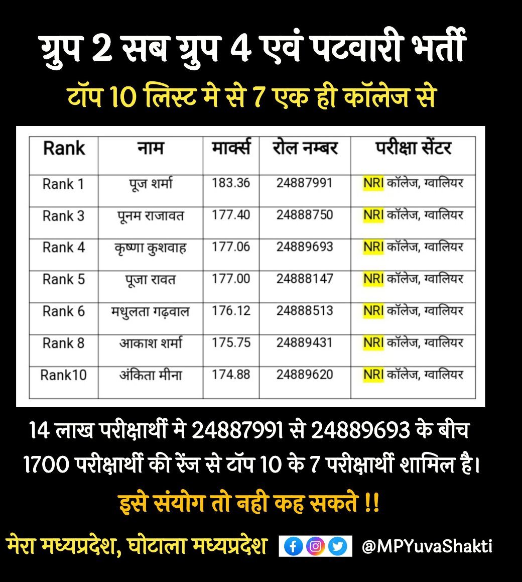 व्यापम में फिर एक बार महाघोटाला पटवारी भर्ती परीक्षा टॉप टेन लिस्ट में एक ही NRI कॉलेज ग्वालियर जिसमे एग्जाम सेंटर के 7 छात्र टॉपर आए । व्यापम में बैठे माफिया और दलाल मध्य प्रदेश के युवाओं का सौदा कर रहे हैं सारे पेपर बिक रहे हैं और सरकार चैन की नींद सो रही है । #mpvyapamgotala