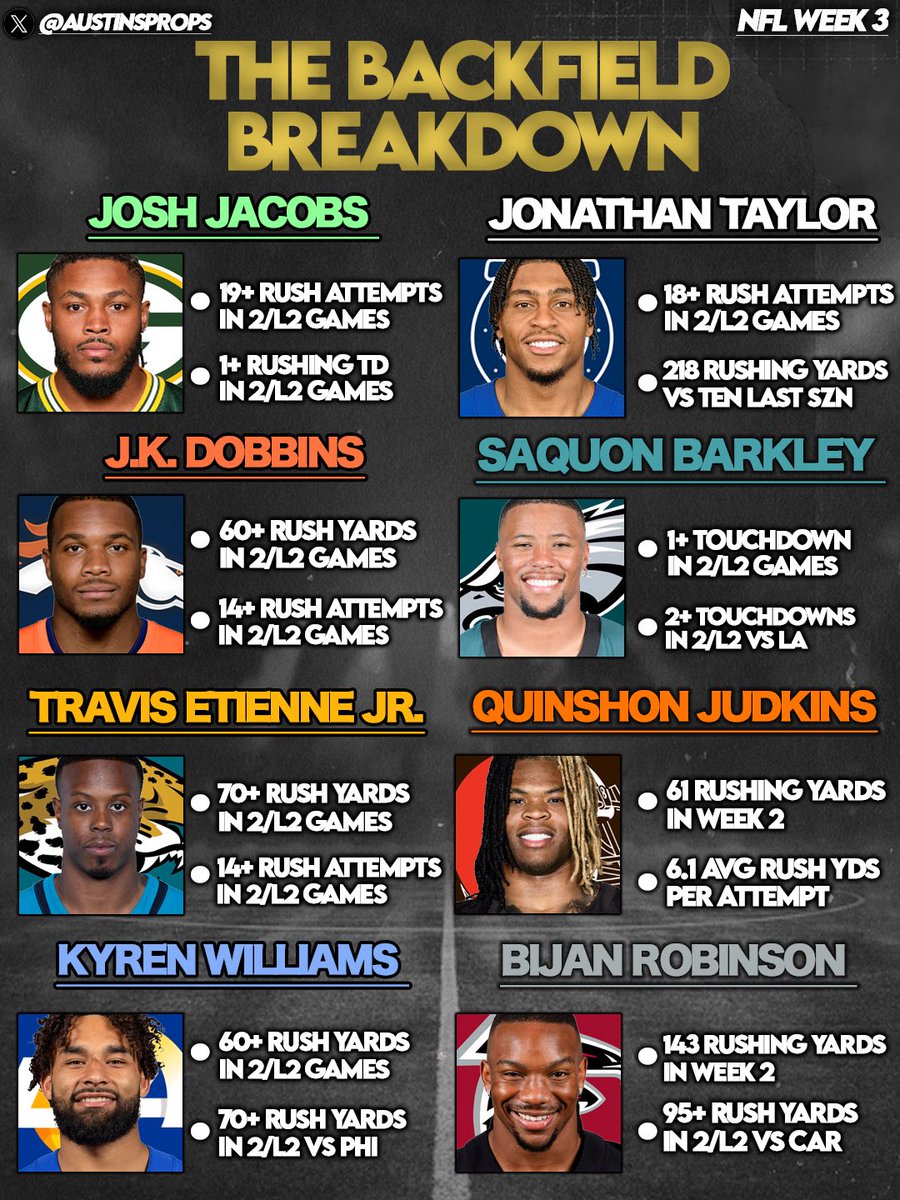 Running Backs Cheatsheets Week 3🏈🔥 •Use this as a research tool for targeting RBs in favorable spots for NFL Week 3 betting or fantasy. 300❤️FOR THE WRs CHEATSHEETS NEXT?!