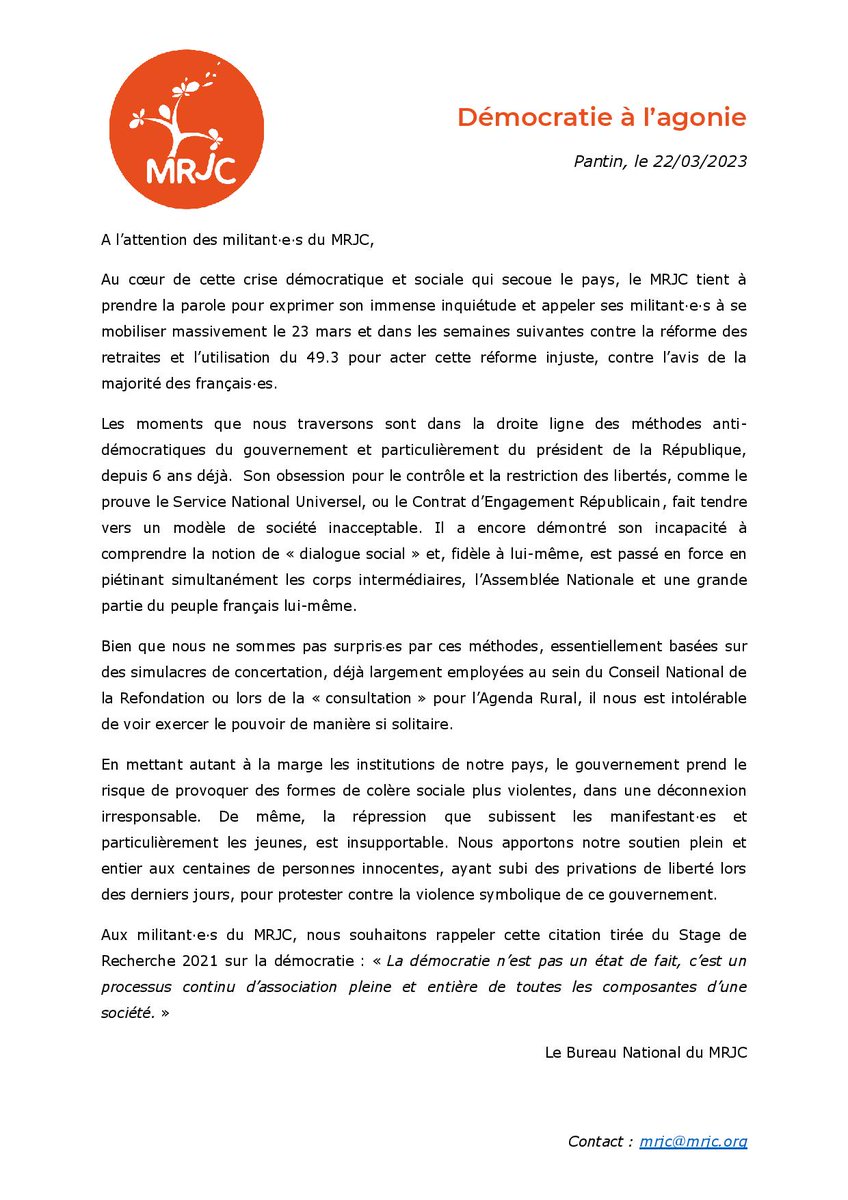 Au coeur de cette crise démocratique et sociale qui secoue le pays, le MRJC tient à prendre la parole pour exprimer son immense inquiétude et appeler ses militant·es à se mobiliser massivement aujourd'hui 👇👇👇