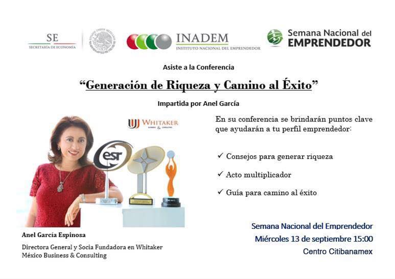 La Lic. Anel García, directora de #Whitaker impartirá la conferencia "Generación de Riqueza y Camino al Éxito" en la Semana del Emprendedor.
