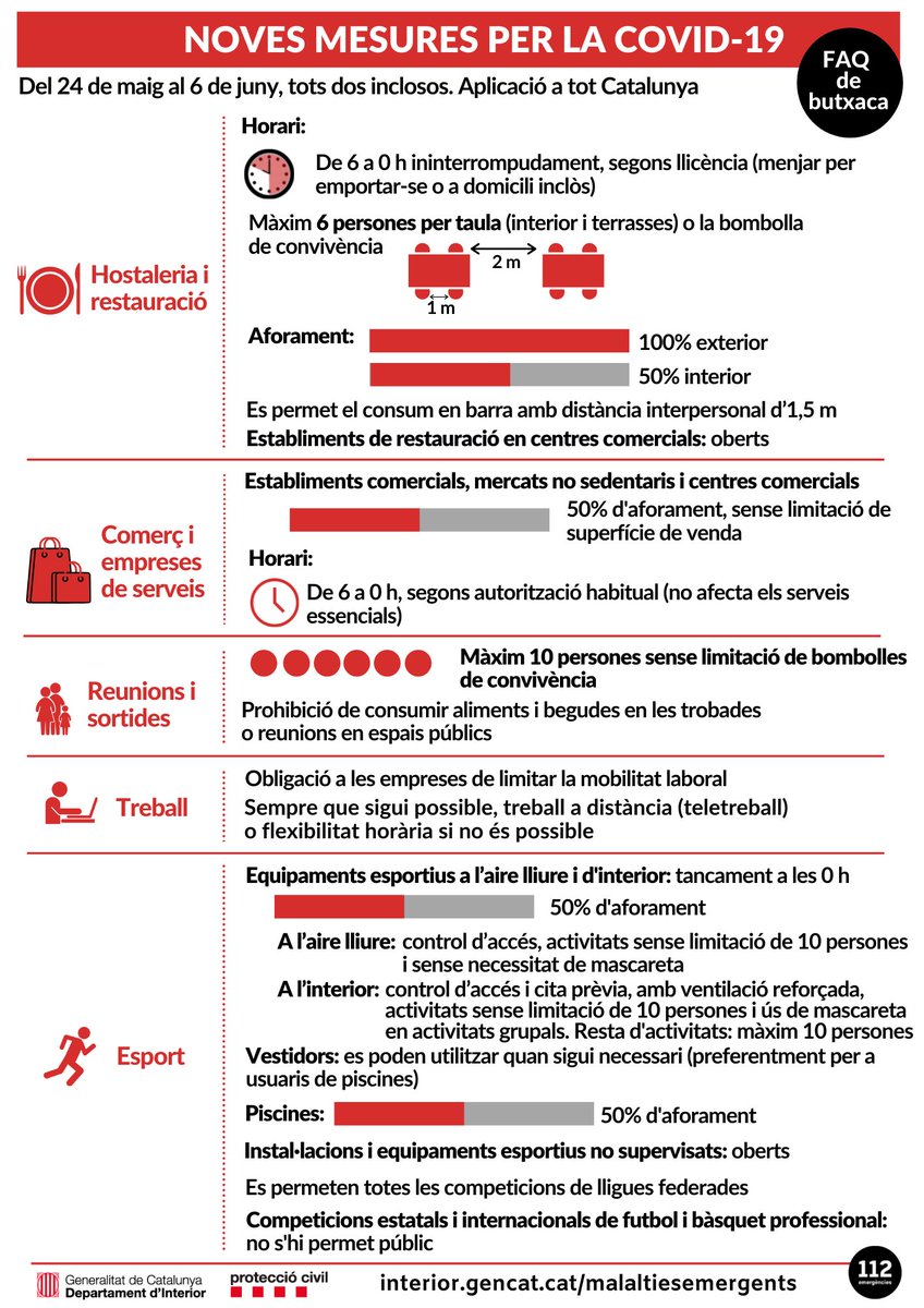 ⚠Resum dels principals canvis en les mesures per a la contenció de la #COVID19 a partir de dilluns 24 de maig 🛍COMERÇ Aforament màxim del 50% Obertura de 6h a 00h (segons llicència) 🍽RESTAURACIÓ Obertura de 6h a 00h Màxim 6 persones per taula (interior, exterior i terrasses)