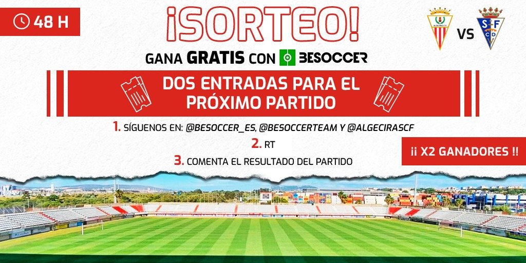 🎁NUEVO SORTEO🎁 Gana dos entradas para el próximo encuentro del @AlgecirasCF . ¡X2 ganadores! Pasos📌: 1: Sigue a @besoccer_ES , @BeSoccerTeam y @AlgecirasCF . 2: RT 3: Comenta el resultado del encuentro Límite 48h. ⌛️ ¡Suerte🍀! #sorteoentrada