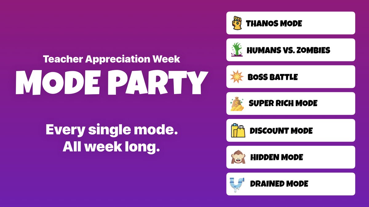 If you use Gimkit, they’re having a Mode Party this week for #TeacherAppreciationWeek!