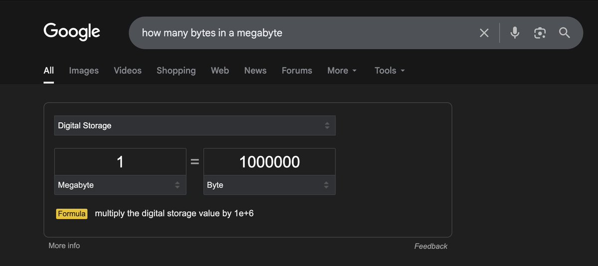 So I noticed that Google claims that 1 megabyte is 1,000,000 bytes. I immediately feel smug and intellectually superior about it, until I read the wikipedia page which informs me that according to ISO, 1MB actually is a million bytes, and 1024 * 1024 is apparently a "mebibyte"