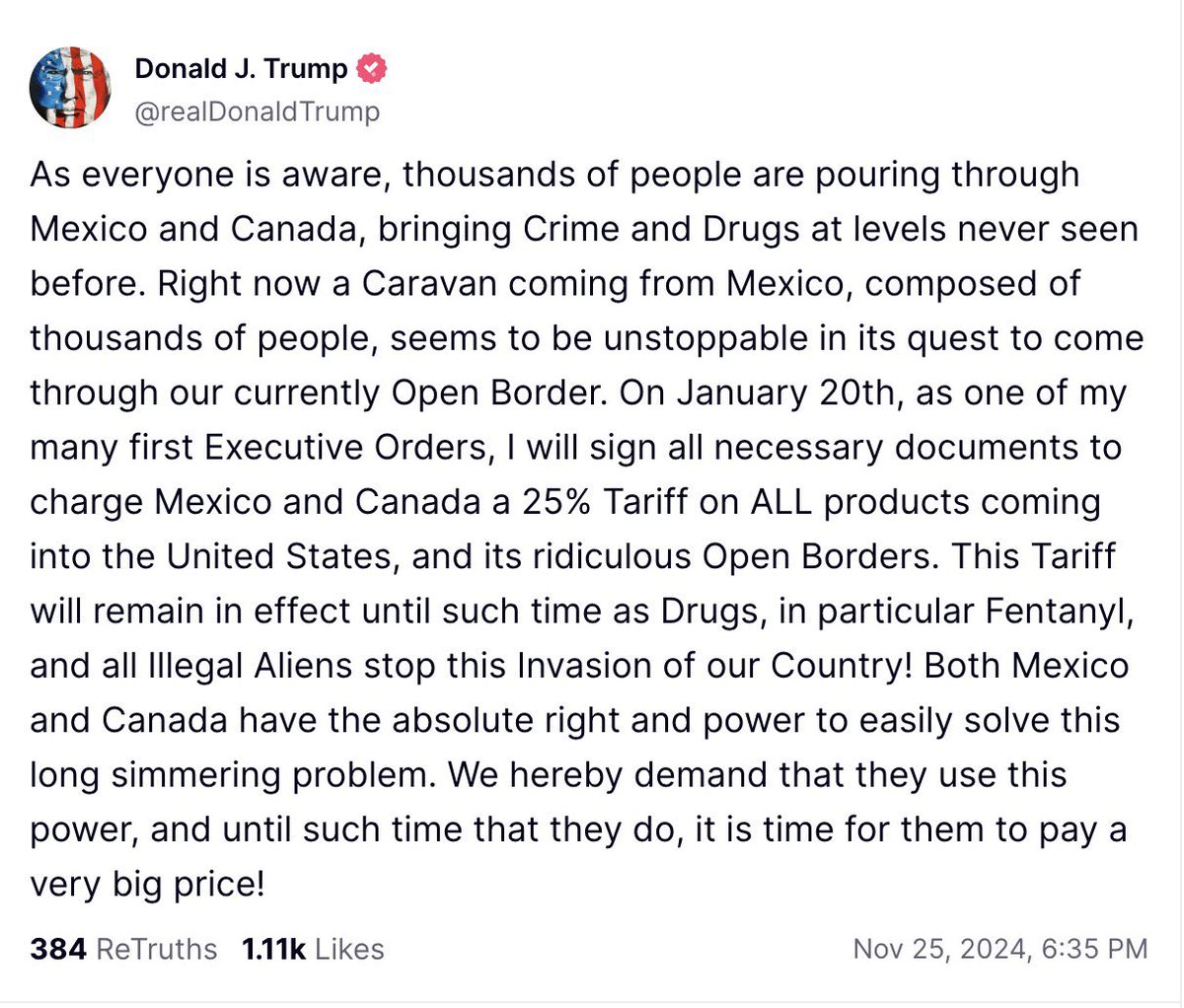 Trump announces that on his first day in office, he’s going to put a 25% tariff on Mexico and Canada and an extra 10% tariff on China. Stock up on whatever you can before January 20 - everything is about to get more expensive. Groceries, cars, medications, all of it.