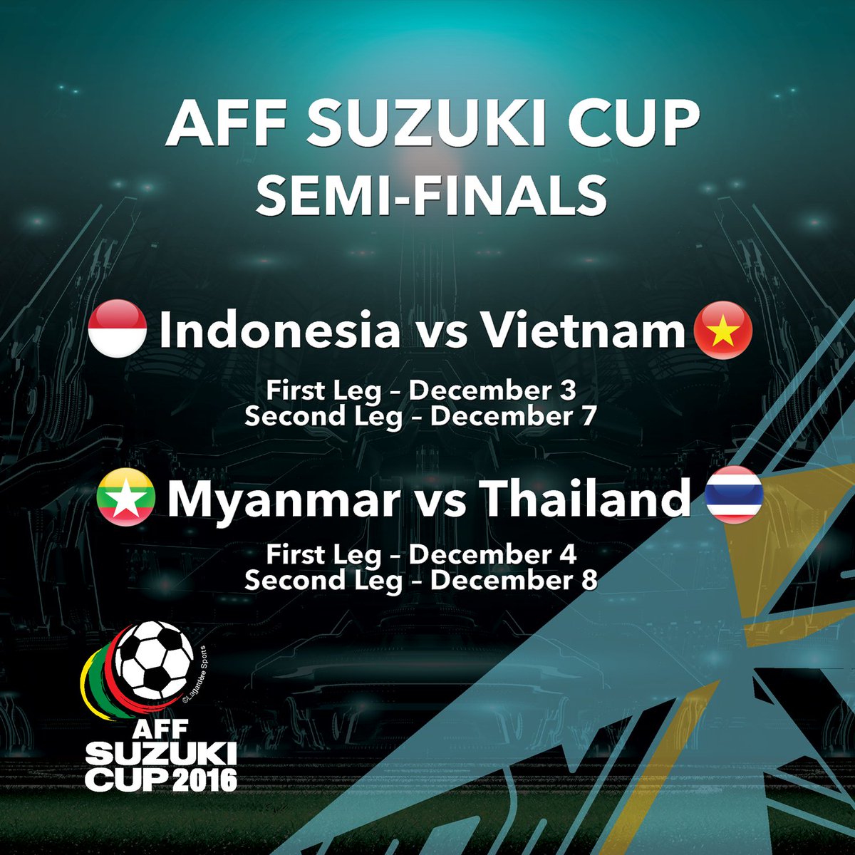 #AFFSuzukiCup semi-finalists! | Indonesia vs Vietnam 3 Dec 2016. | Myanmar vs Thailand 4 Dec 2016.