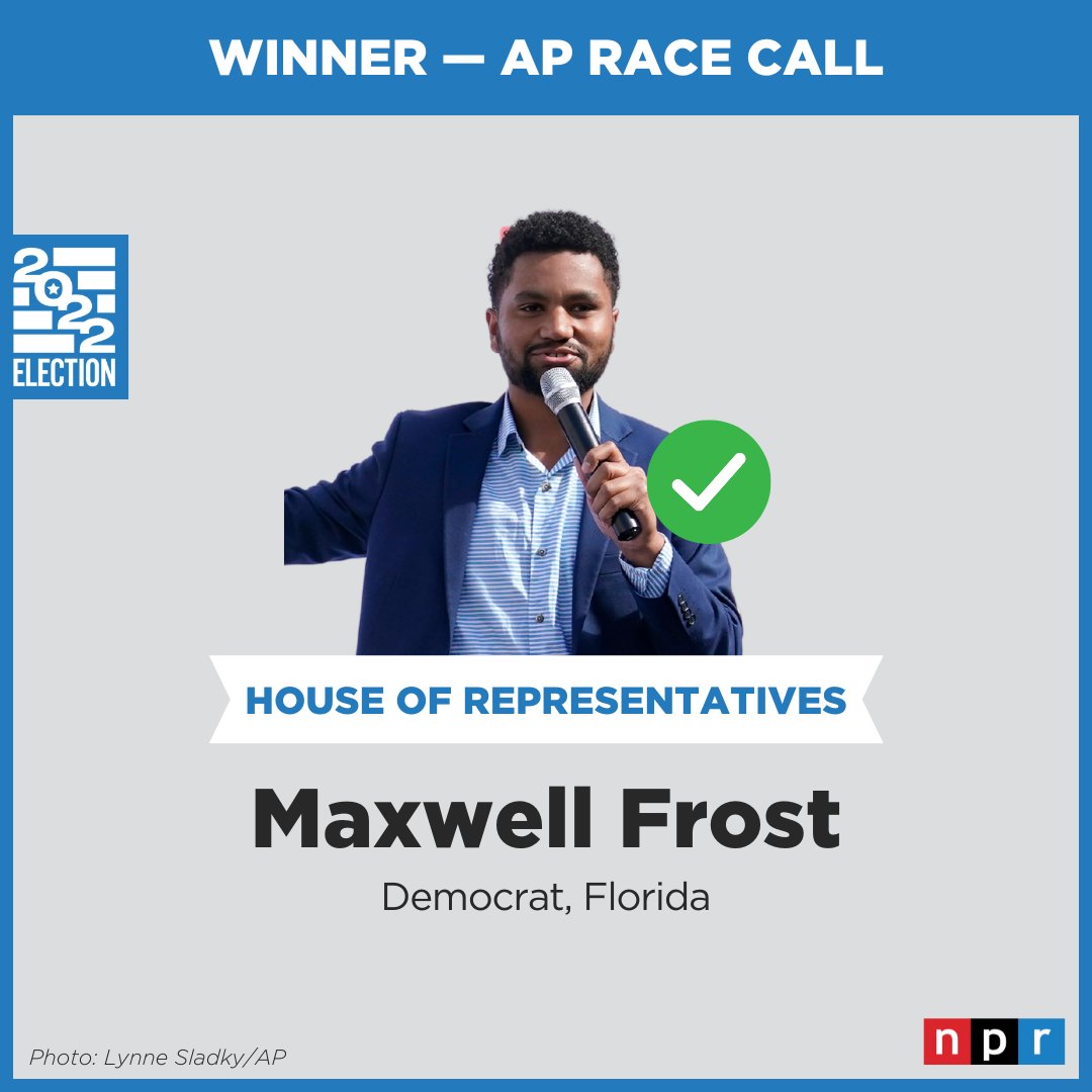 BREAKING: Democrat Maxwell Frost has won in Florida's 10th Congressional District, making him the first member of Gen Z elected to serve in the U.S. Congress. n.pr/3fMpl1w
