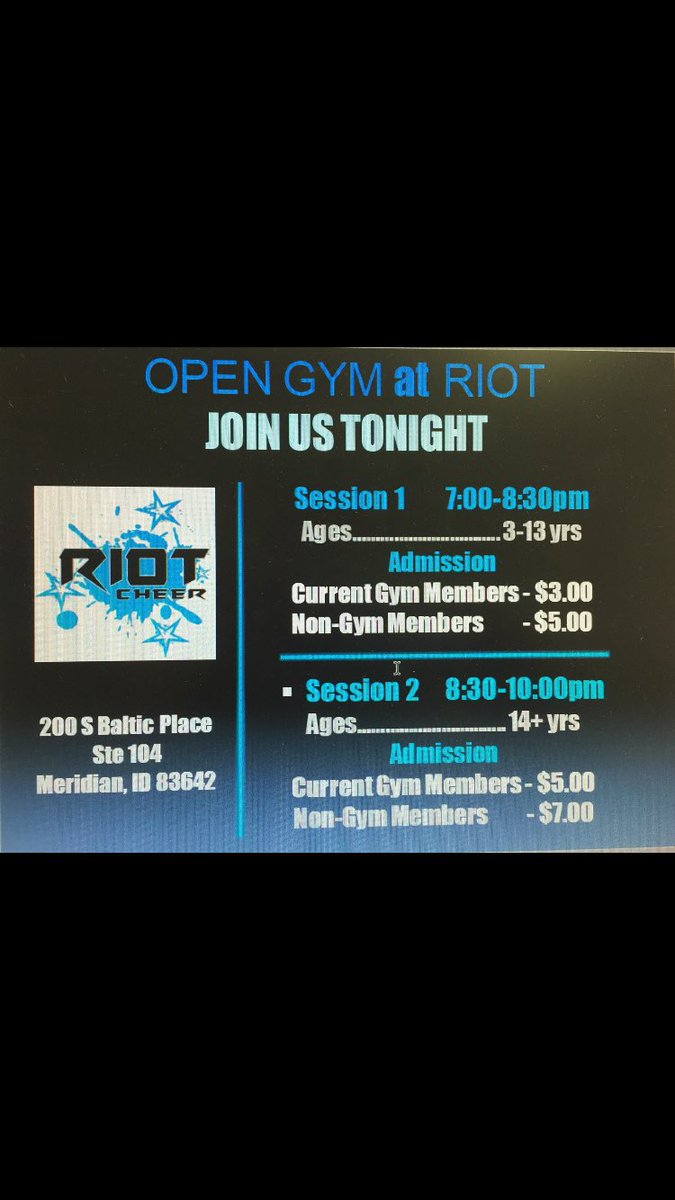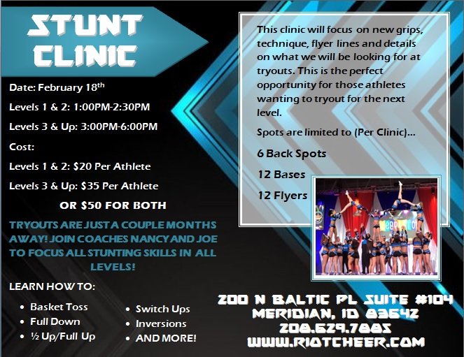 USASF certified member allstar cheerleading gym located in Meridian,ID. We specialize in competitive cheerleading, advanced tumbling and stunting. (208)629-7885 Riotcheer.com Meridian, ID Joined July 2013-