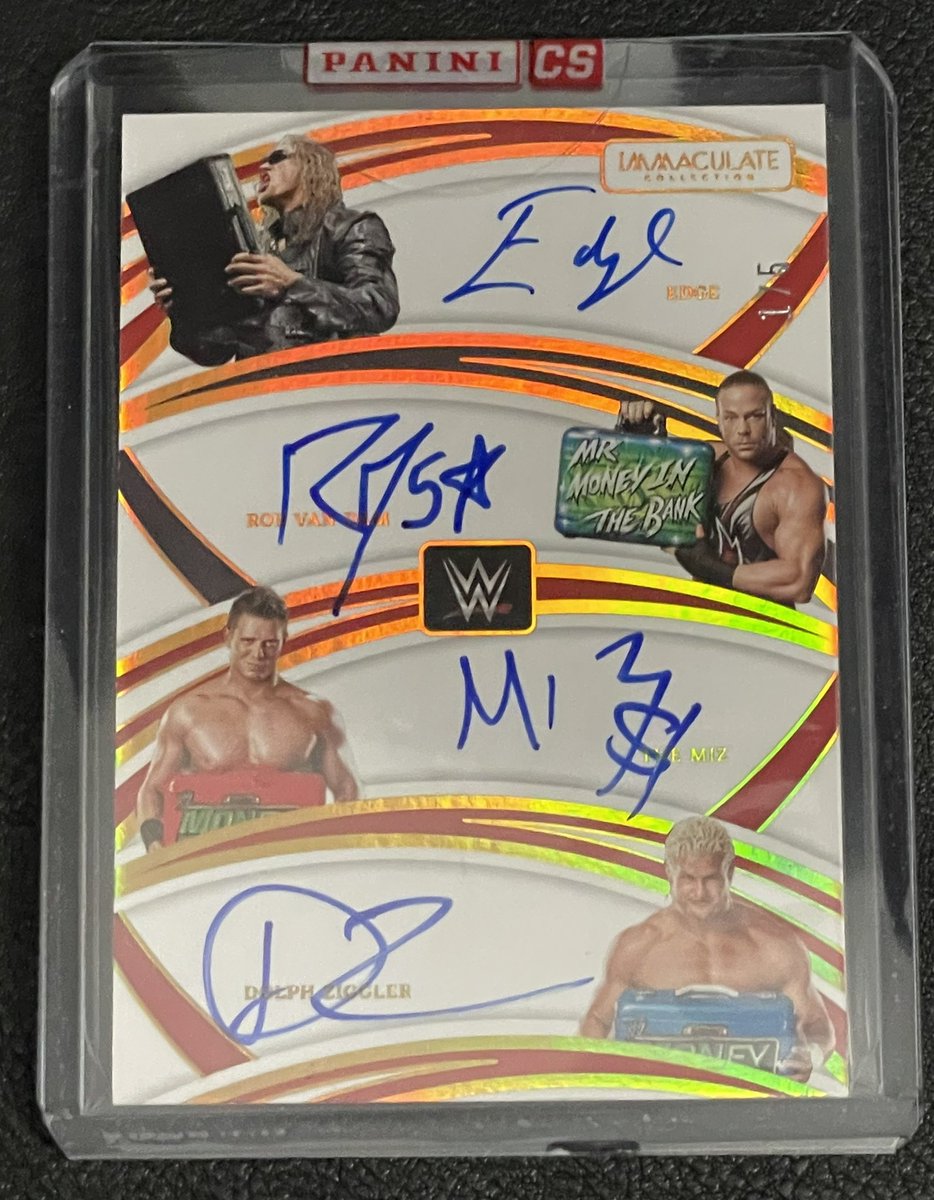 Got my grail card in the mail today. Absolutely called it being Money in the Bank theme as well. 4 absolute greats! Thank you @EdgeRatedR @TherealRVD @mikethemiz @HEELZiggler 🔥🔥🔥🔥🔥