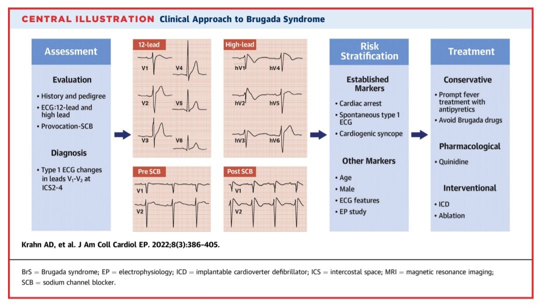 Síndrome de Brugada. ✨️Excelente revisión por @JACCJournals 💯 🟢Tipo 1 (1:2000), tipo 2-3 (1:500). >♂️ 🟢Fisiopato: 💥Gen SCN5A➡️CanalesNa Nav1.5 🟢Clínica: síncope, arritmias, MSC☠️ 🟢Dx: puntuación Shangái 🟢Tto: conservador, quinidina, DAI, ablación. doi.org/10.1016/j.jace…