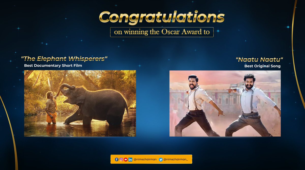 A roaring success at #Oscars2023! "The Elephant Whisperers" and "Naatu Naatu" bring home a double win! Congrats to the talented teams behind these unforgettable cinematic gems, including @mmkeeravaani, @boselyricist, @EarthSpectrum, and @guneetm .