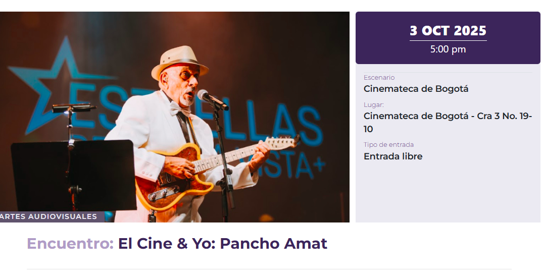 "El cine y yo" con Pancho Amat director de Estrellas de Buenavista 📅viernes 3 de octubre ⏰5pm 🚁@CinematecaBta cra. 3 # 19-10 Entrada Libre. #salsaalparque2025