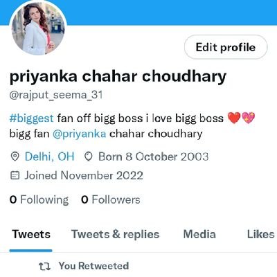 21K Followers 9 Following This is the Official Fanclub of @PriyankaChaharO || Follow us for all Stats, Trend Updates and More about her || Stay Connected ā¤ļø