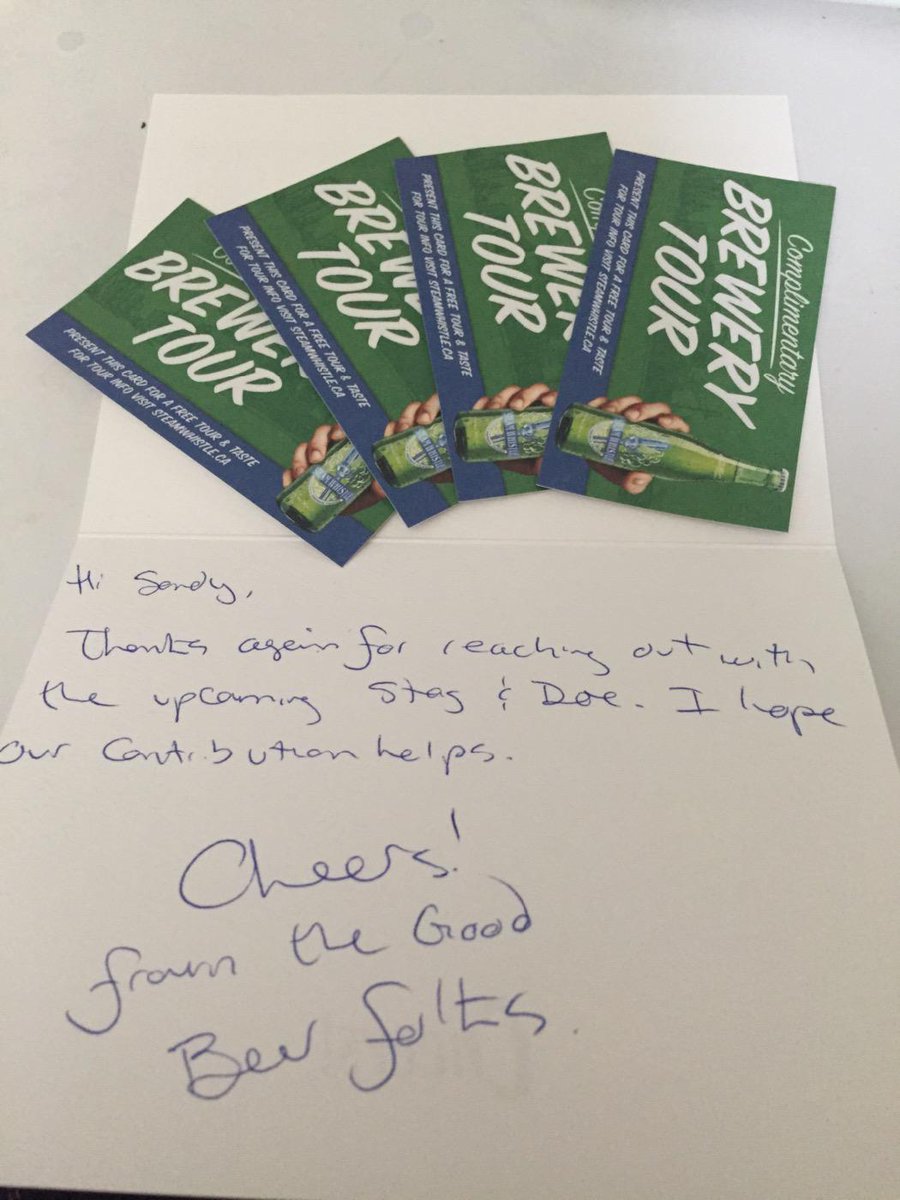 How awesome is @SteamWhistle!?! Taking the time to handwrite a card & donate a gift for our stag&doe! #bestbeerever