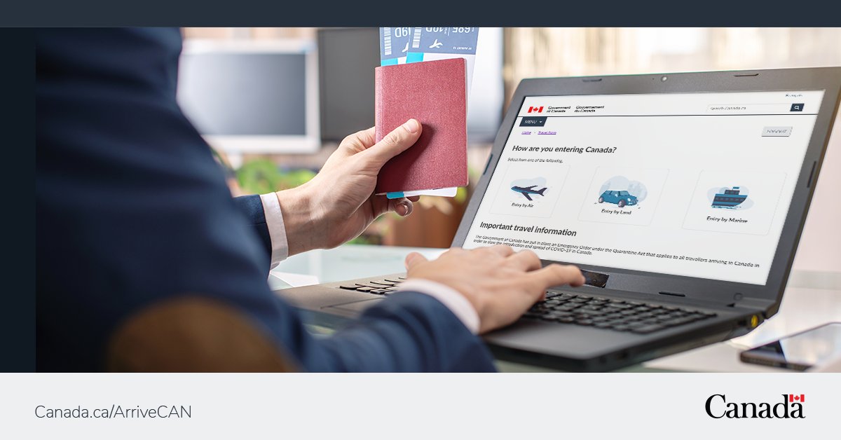 All travellers entering Canada must submit their #COVID19 information via #ArriveCAN prior to their arrival. It only takes a few minutes and helps keep each other safe. Download the app or sign in online: ow.ly/M4cJ50Corzu 🇨🇦