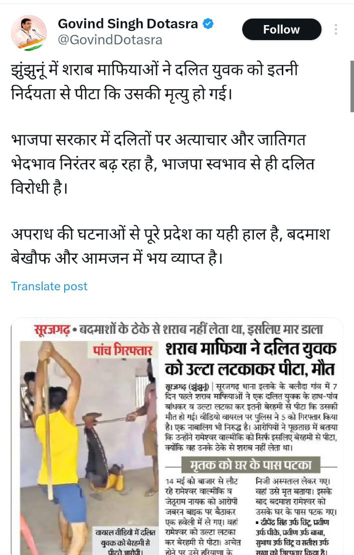 वर्तमान राजस्थान सरकार ध्यान दे एक दलित व्यक्ति को बेरहमी से पीट पीट कर हत्या कर दी। ऐसे लोगों को फांसी हो। @narendramodi @BhajanlalBjp